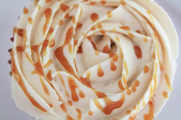 To create the strands of caramel sauce, dip a small fork into the sauce and allow strands to drip down onto the frosting while swinging the fork back and forth. You can also put the sauce in a decorating squeeze bottle and decorate that way.